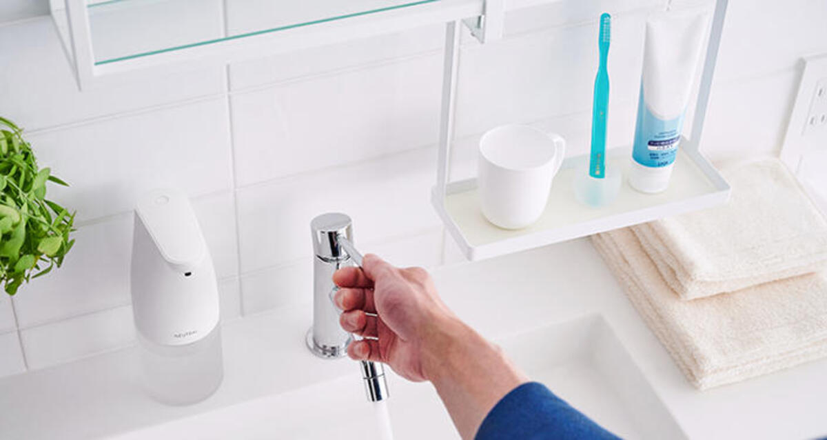 まずは、洗面用品のカラーを統一させることで、まとまりのある洗面所を演出しましょう。白色で揃えれば、清潔感のあるクリアな印象になりますよ。また、生活感を出さず洗練された洗面所を目指すなら、絵柄がデザインされた市販のハンドソープもソープディスペンサーに入れ替えるのがおすすめです。自動で泡タイプのソープが出てくる〈NEUTRAL オートソープディスペンサー〉なら、汚れた手で触れなくてよいので、衛生面も安心です。
