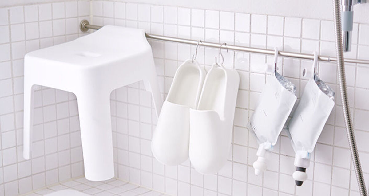 〈タワー・引っ掛け風呂イス〉や〈マーナ・お風呂のスリッパ〉も、掛けたり吊るしたりできるようにデザインされているので、浴室内のタオルバーやシャワーフック、ランドリーパイプに掛けておけば、乾かしながら浮かせて収納できとても衛生的です。