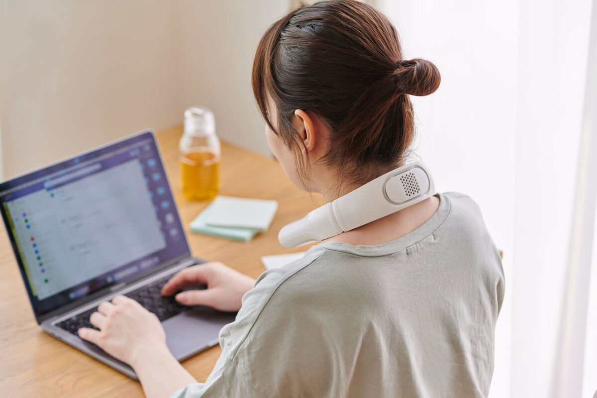 〈ワイズ・COOL CHARGE neck〉は、首にかけるタイプの充電式保冷剤。スイッチを入れるとファンが回転し、冷却プレートが冷えていく仕組みです。首筋に冷却プレートが触れるので、ダイレクトに冷たさを実感。ゆるやかなカーブを描く形状で圧迫感もなく、男女問わずお使いいただけます。通勤時にも取り入れやすい、スタイリッシュなデザイン。