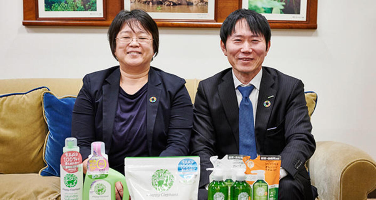 園田:こんにちは。ハンズで清掃用品のバイヤーをしている園田です。今回は象の日にちなんで、〈ハッピーエレファント〉という素敵な名前の洗剤を手がけていらっしゃる〈サラヤ〉さんにやってきました。お話していただけるのは広報宣伝統括部の廣岡さんです。本日はよろしくお願いします!
