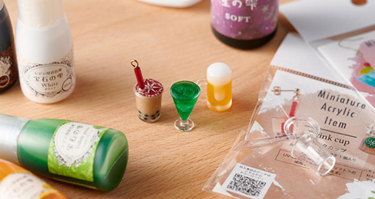 アクセサリーの本体となる〈ミニチュアアクリルアイテム〉を用意します。今回はタピオカドリンクをつくるので「ドリンクカップ」を使用します。他にも「カフェカップ」「ビアカップ」などさまざま。つくりたいアクセサリーのイメージに合わせて選んでみてください。日本製でバリが少なく、透明度が高いので、キレイにつくれますよ。