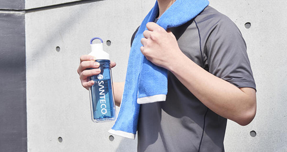 ふたの部分のOリングや、広い飲み口が使い勝手の良い〈SANTECO〉のボトル。トレーニングの合間に持ち運びやすく、手早く水分補給できるのが魅力です。また、二重構造で結露のつきにくいボディは、化学物質BPAを含まないプラスチックでつくられているので、ボトル自体の安全性もバツグンですよ。