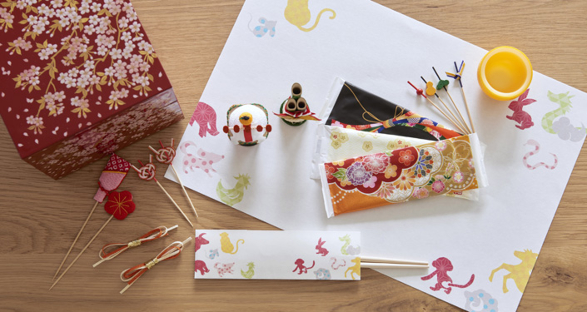 おせちで大切なのは、見た目の華やかさ。そこでお試しいただきたいのが、おせちに小物で飾り付けをするという方法です。毎年作っているメニューはそのままに、お花や水引といったモチーフの飾り楊枝をプラスするだけで、見映えがグンと華やかに。手のひらサイズのかわいらしいオブジェをお重の中に入れてみたり、個性的な入れ物でアクセントをつけてみるのもいいでしょう。仕上げにはおしぼりも新年らしい上品なデザインでまとめると、写真映えはバッチリです。