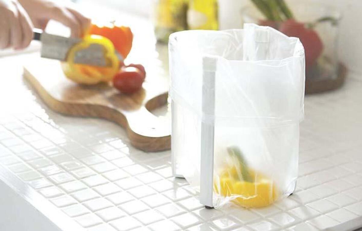 <tower>シリーズの中で一番のヒット商品は「ポリ袋エコホルダー」。コンビニ袋や小さめのポリ袋をセットしてシンク横に置き、野菜の皮や食べ残しなどをポイポイ。片づけるときは袋ごとまとめてごみ箱へ捨てれば、生ごみを溜めることなくいつでも清潔なキッチンをキープできます。