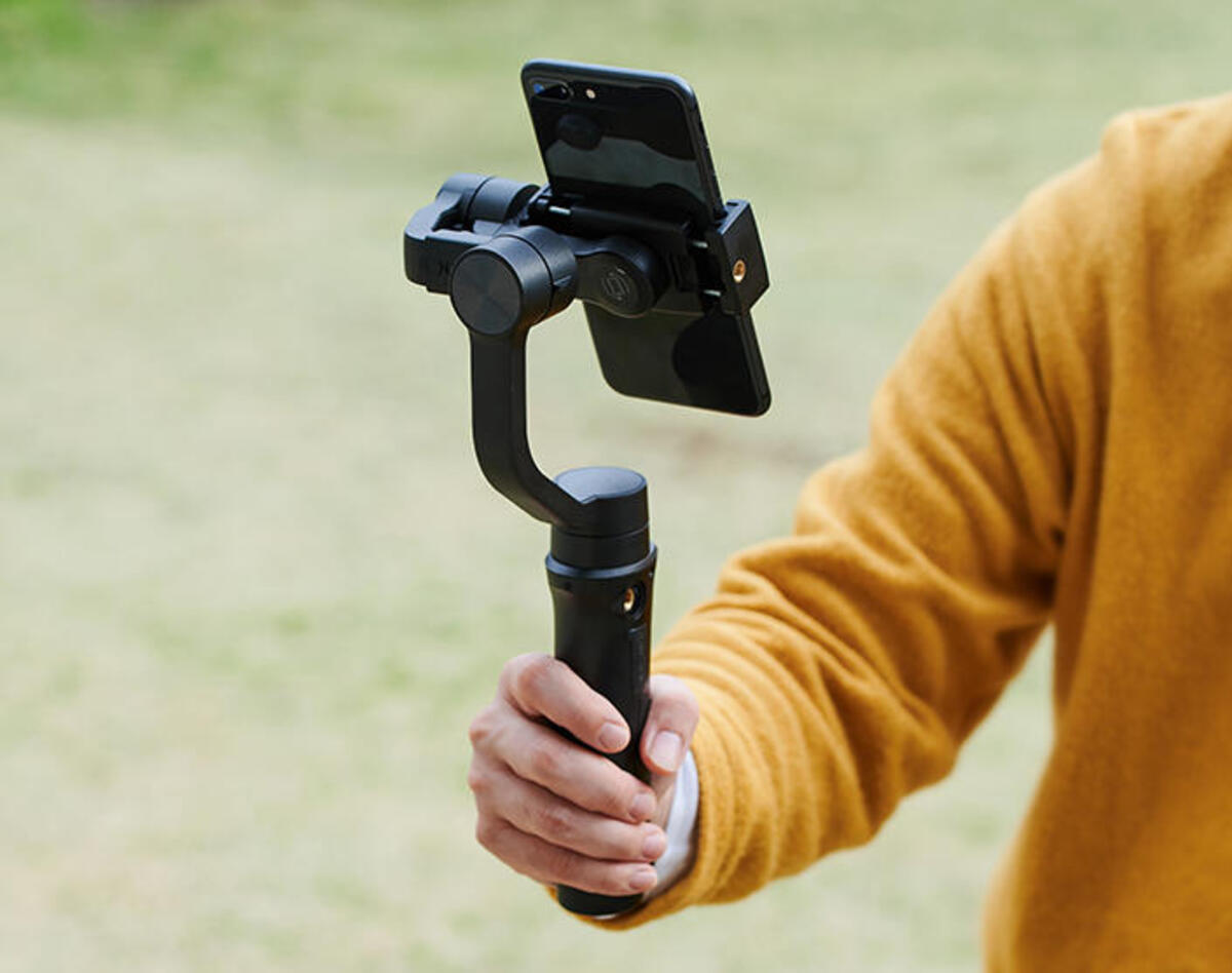 歩きながら撮影をしたり、動いているものを撮影したりなど、動画撮影には揺れがつきもの。その揺れから起こる「手ブレ」を解消してくれるのが、この〈スタビライザー〉です。使い方は、まずスマホアプリをインストールして、Bluetooth®と接続。その後、スマホをスタビライザーにセットして「キャリブレーション」と呼ばれる調整作業を済ませれば準備はOK。ハンドルを持ちながら撮影すると...どの方向を向いても、常にスマホの向きを安定させながら撮影できるようになります。手元のジョイスティックを使えば、ズームや回転などさまざまな撮影方法も切り替え可能。プロの撮影気分も味わえるアイテムです。