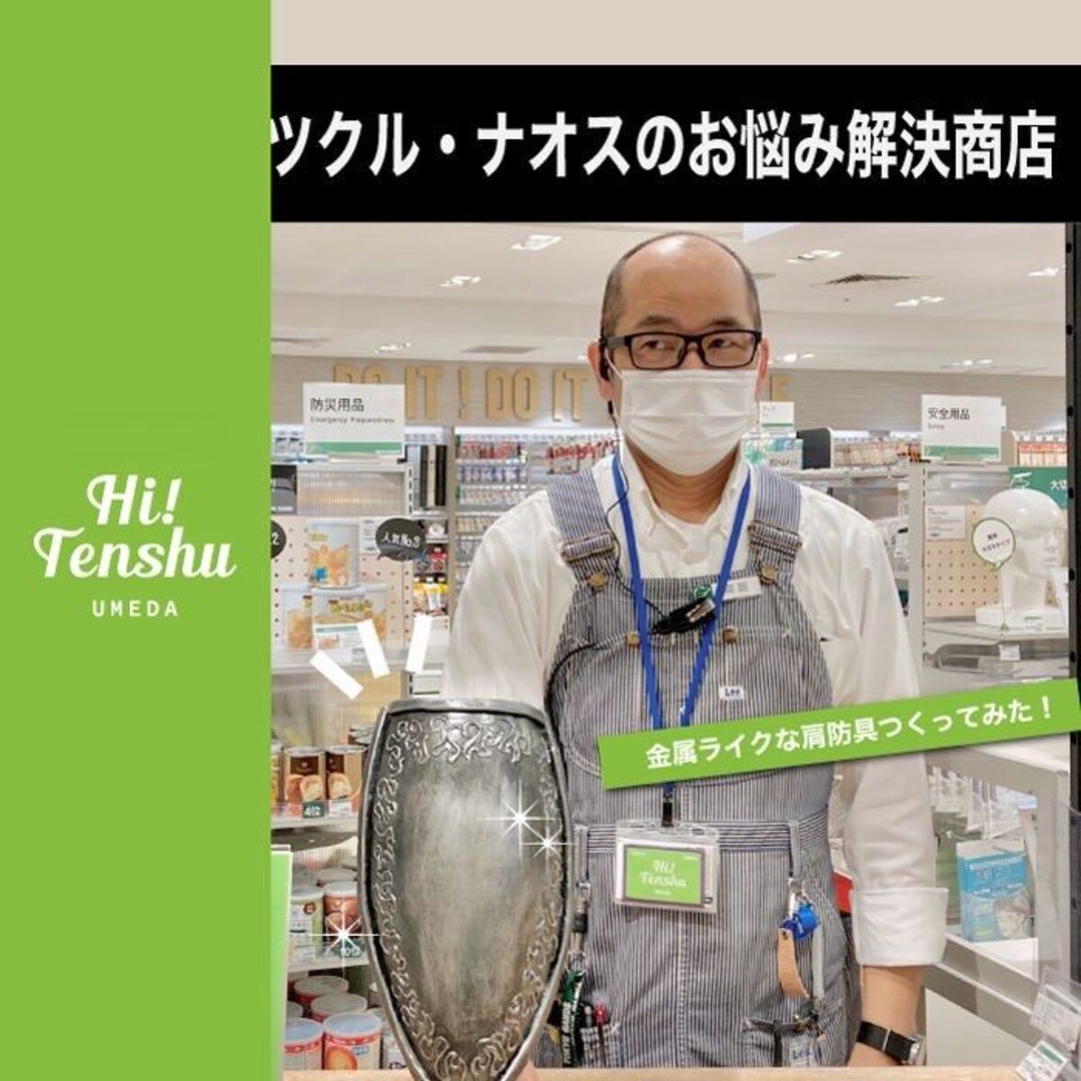 今回製作した肩防具は梅田店11Fツクル・ナオスのお悩み解決商店店主のブースに展示しています。ぜひ一度ご覧ください。