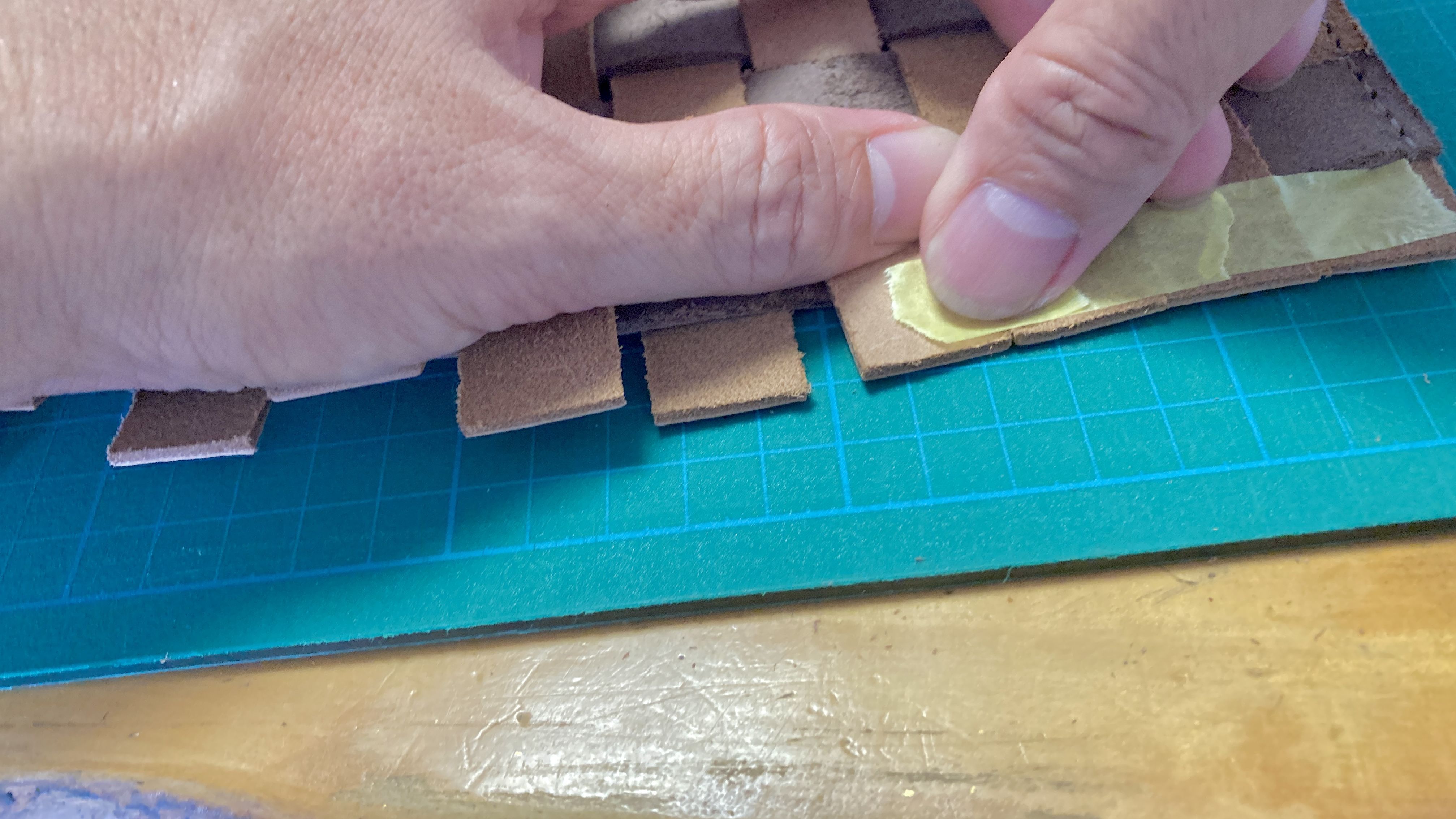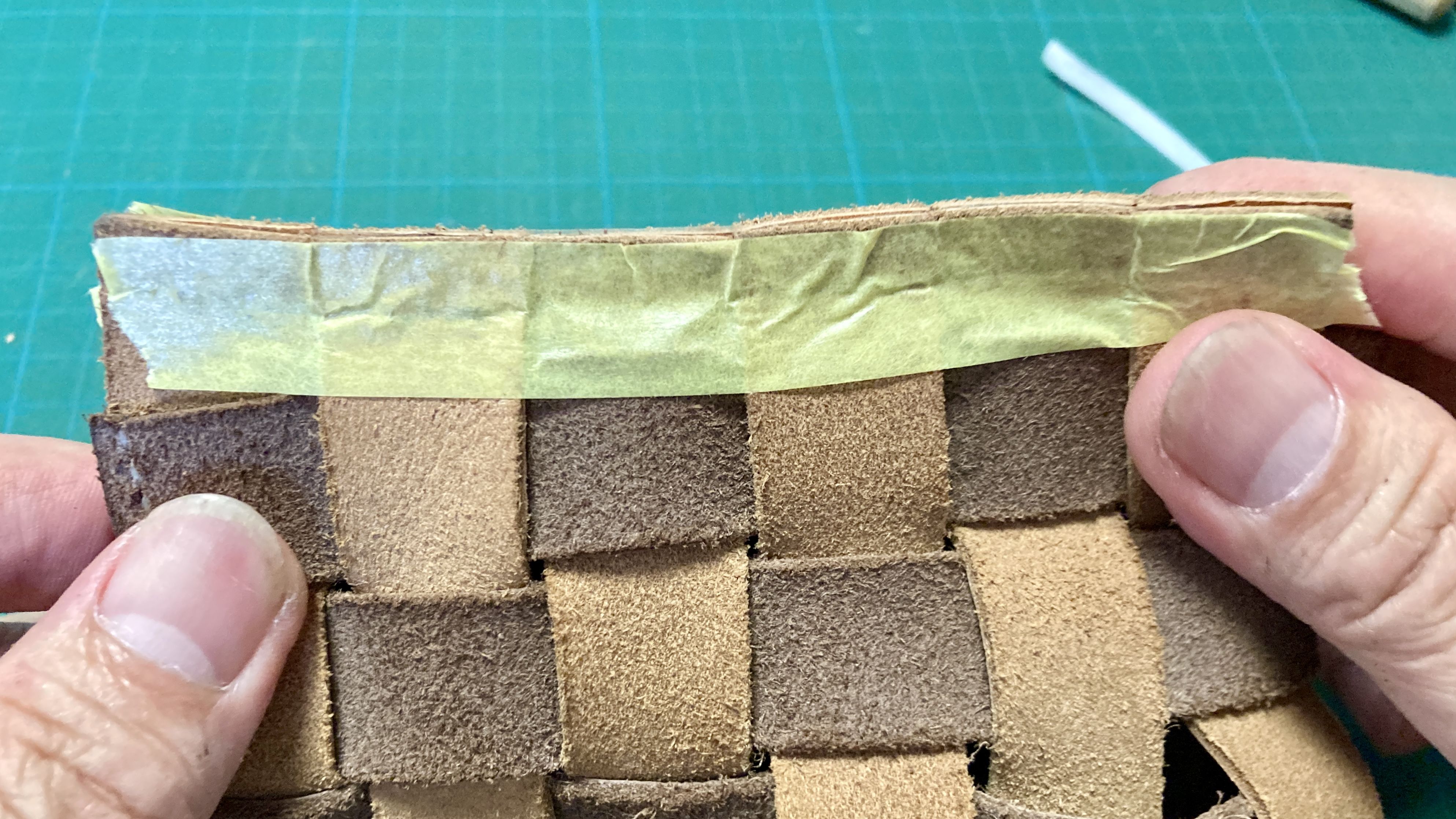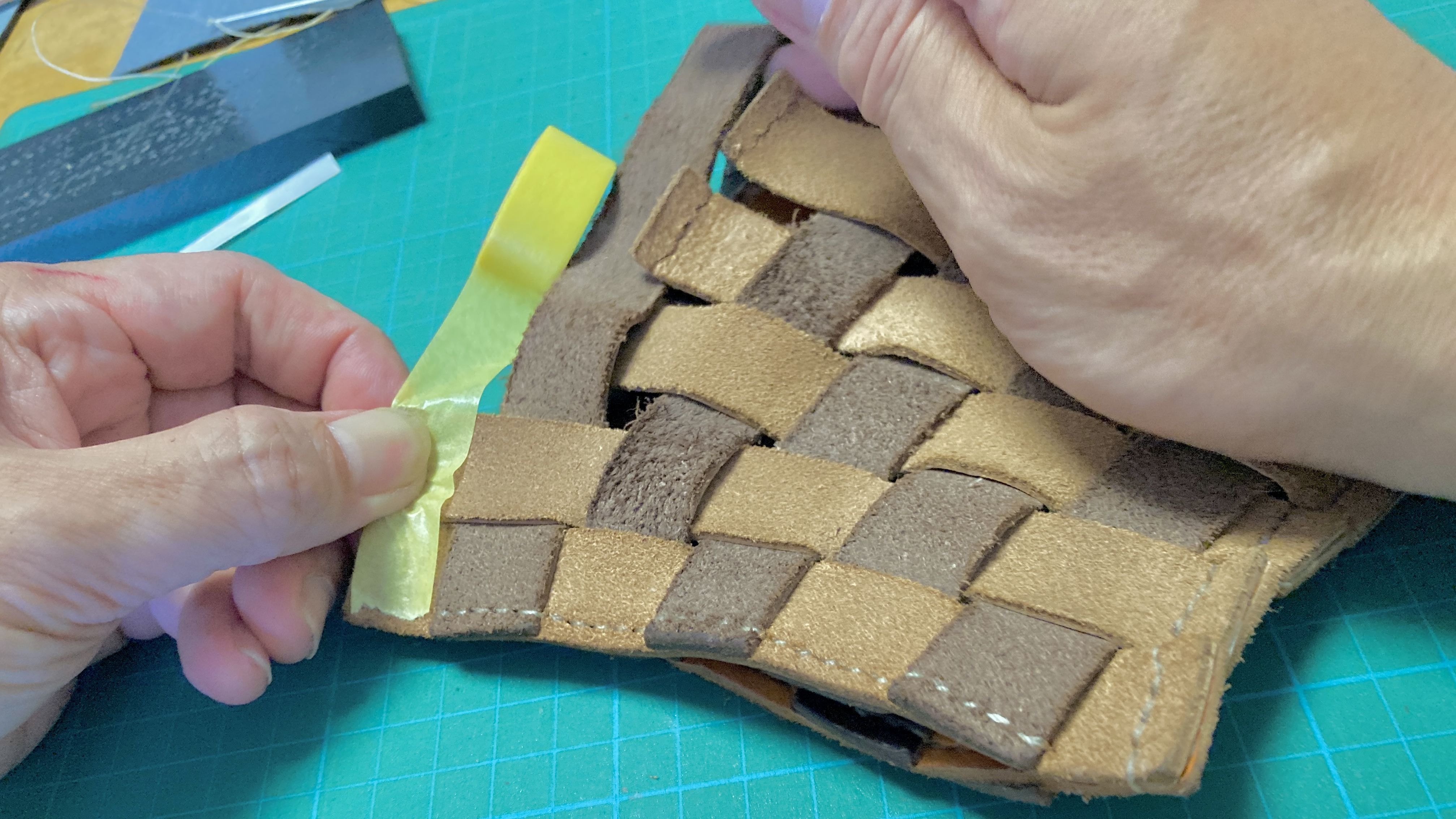 ここからは力業です。端を無理やり寄せてきて、なるべくすきまができないようにマスキングテープで仮止めします。革の裏側に貼ってくださいね。