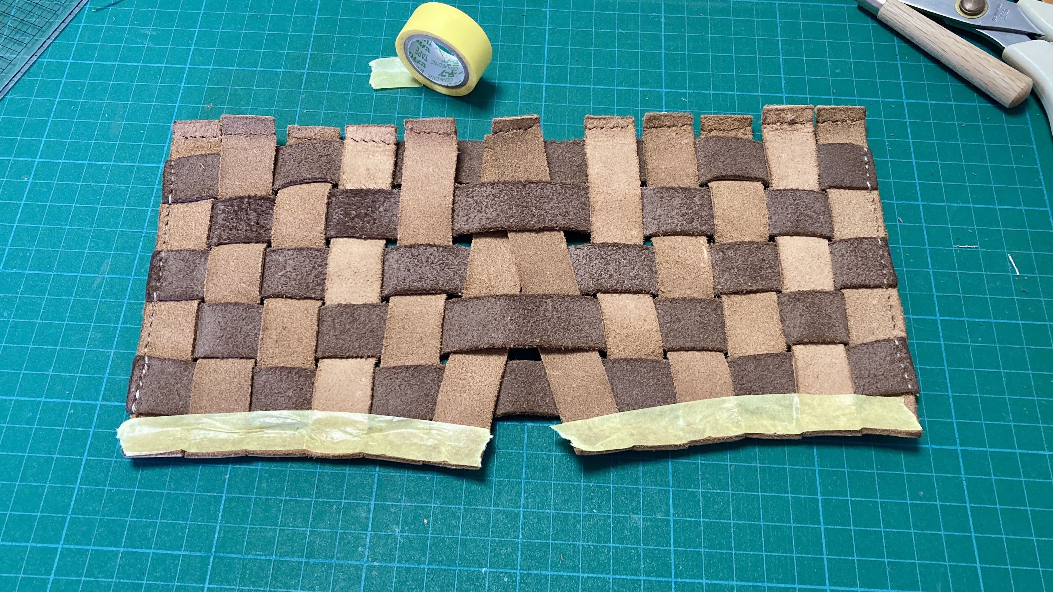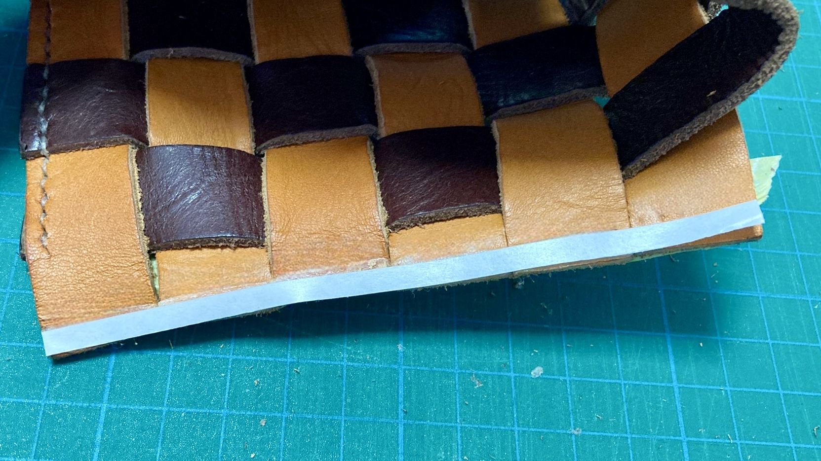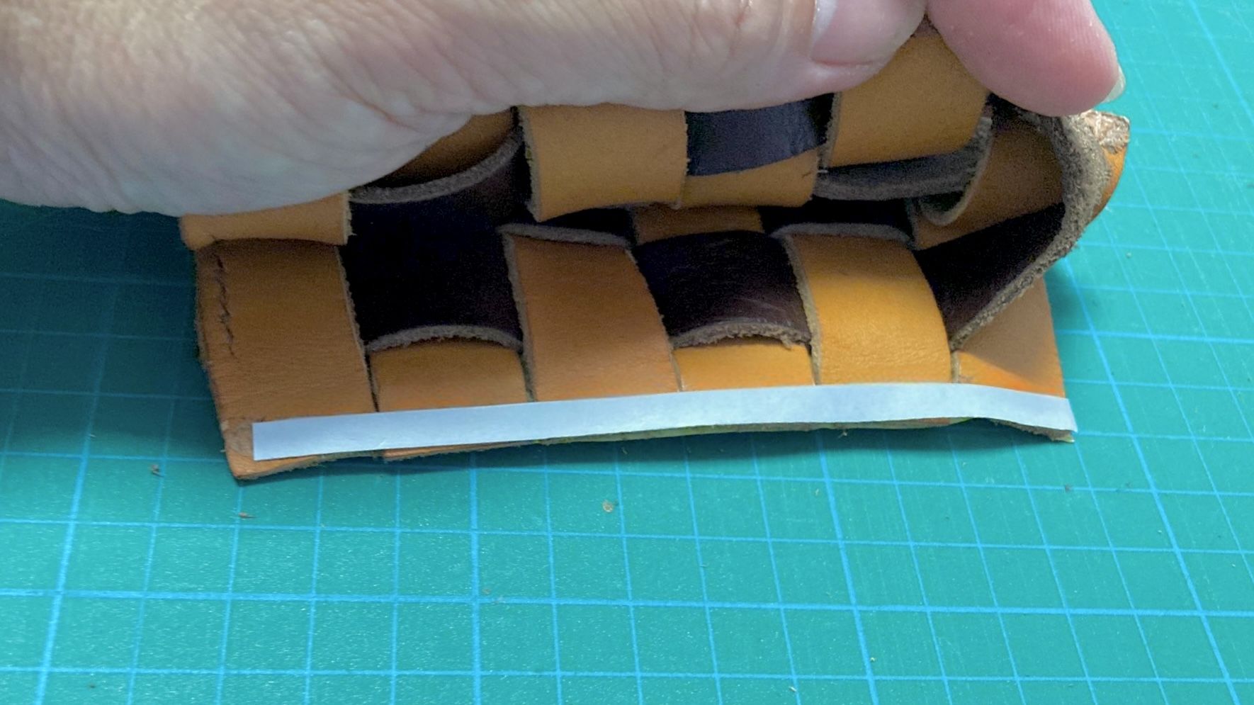 ここからは力業です。端を無理やり寄せてきて、なるべくすきまができないようにマスキングテープで仮止めします。革の裏側に貼ってくださいね。
