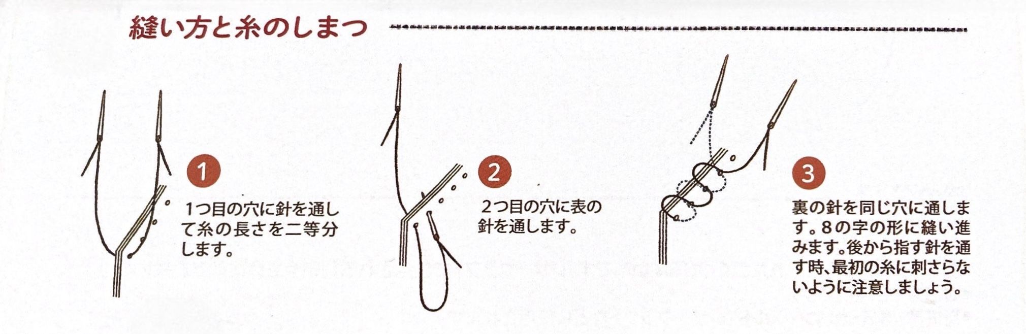 準備が出来たら縫います。糸の付け方と縫い方はこの様にします。