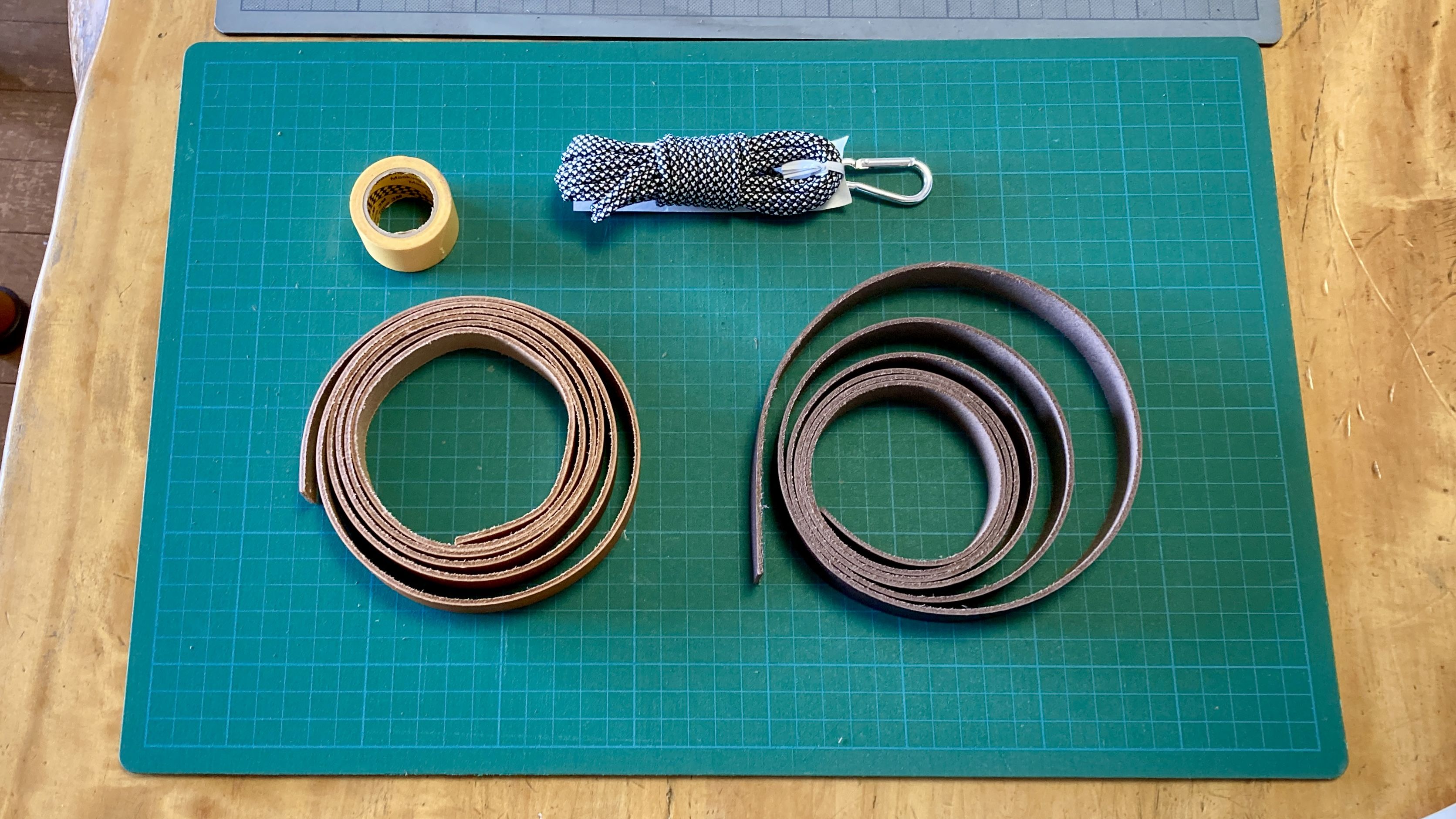 これも革の端材を帯状にカットしてつくりました。やわらかい革だったのでフニャフニャです。今回はこれを基につくりました。