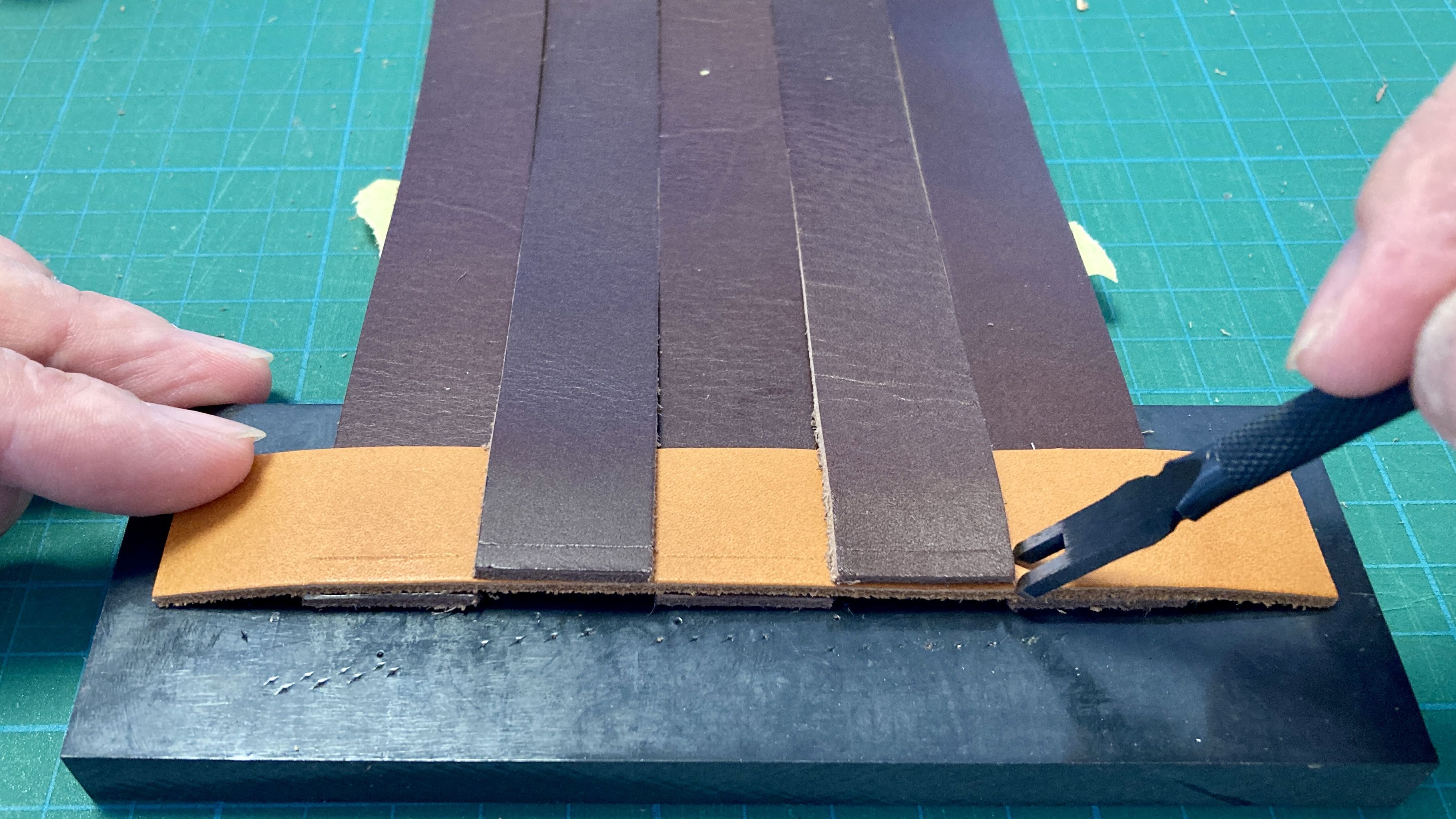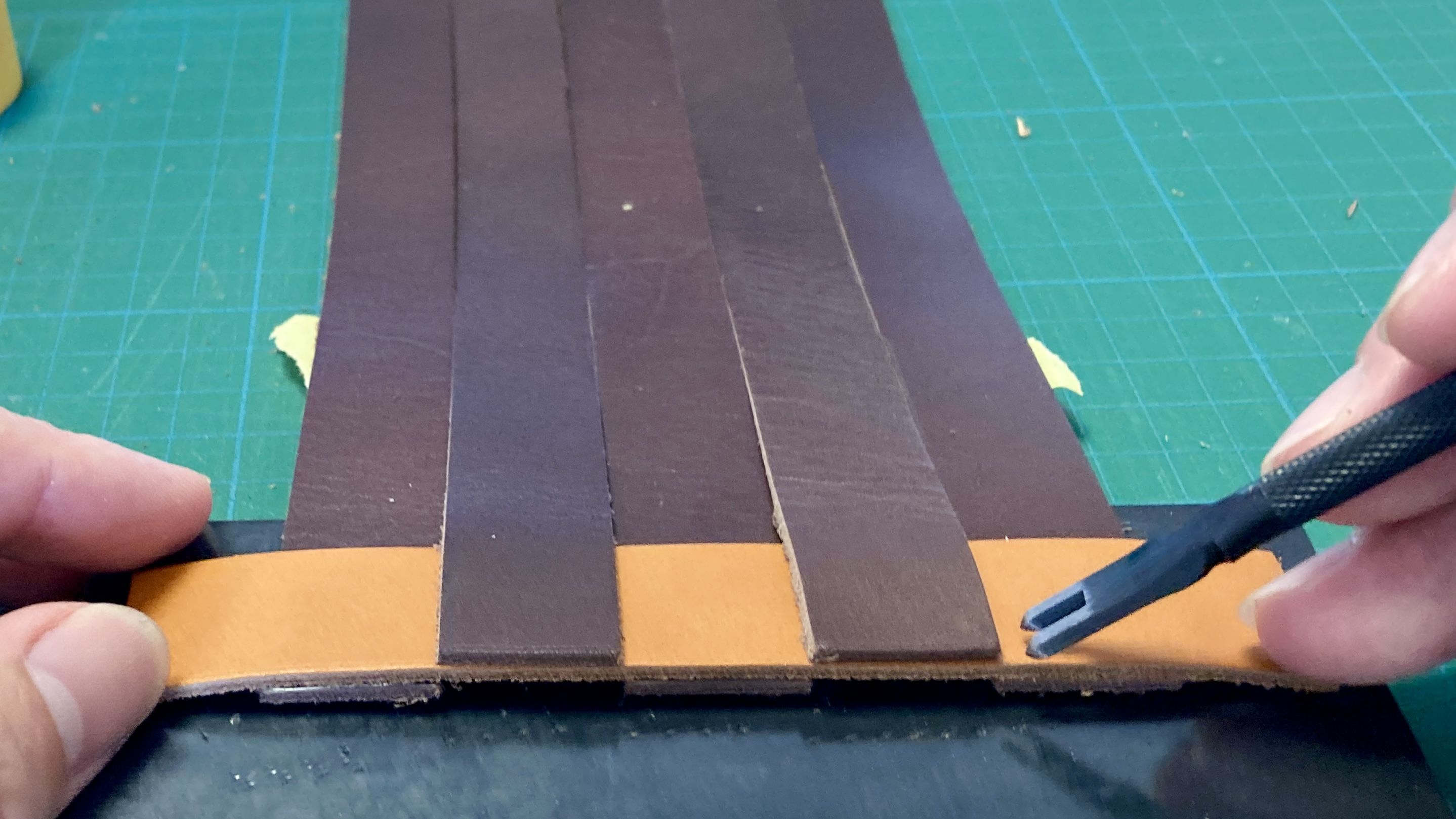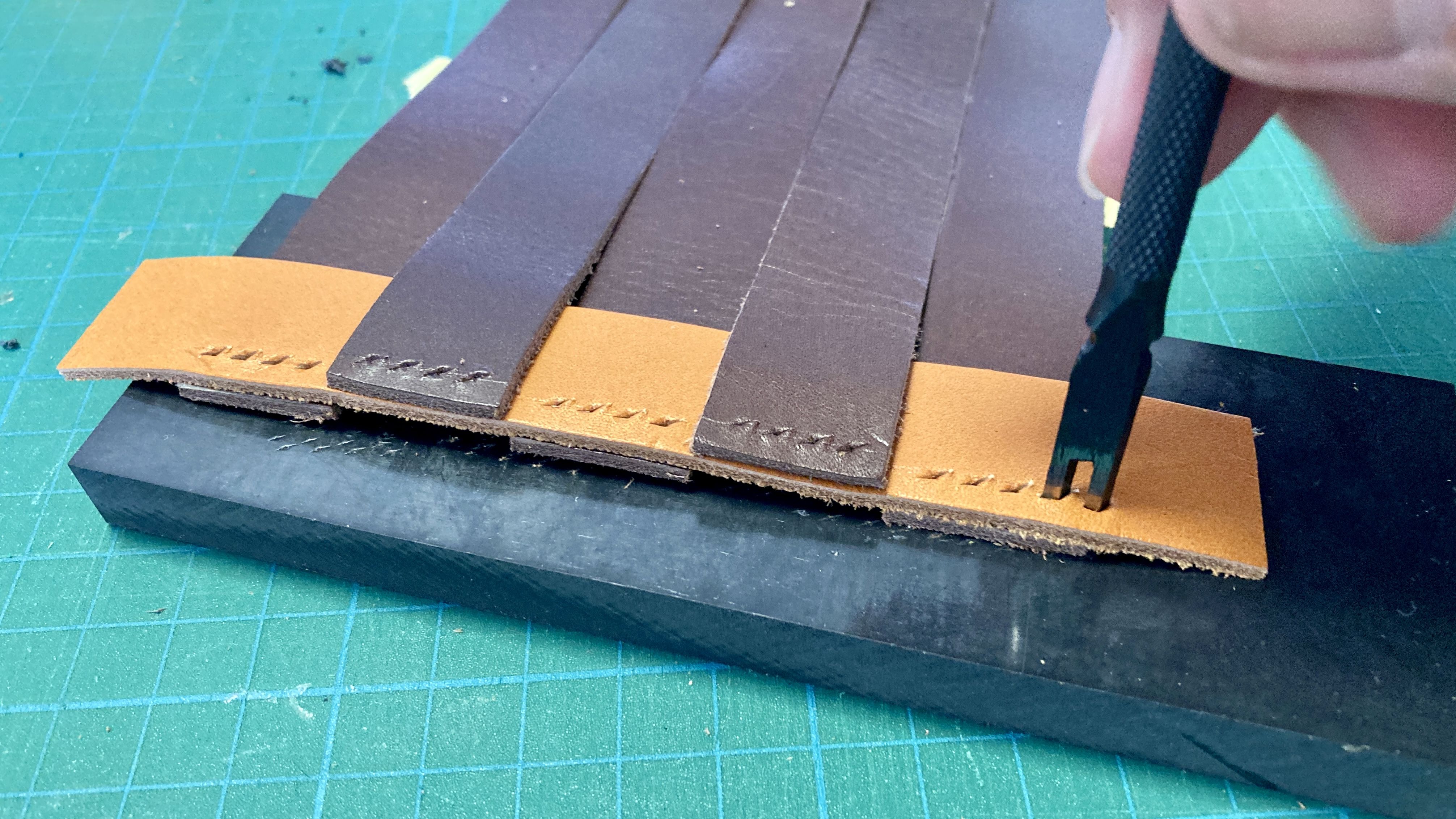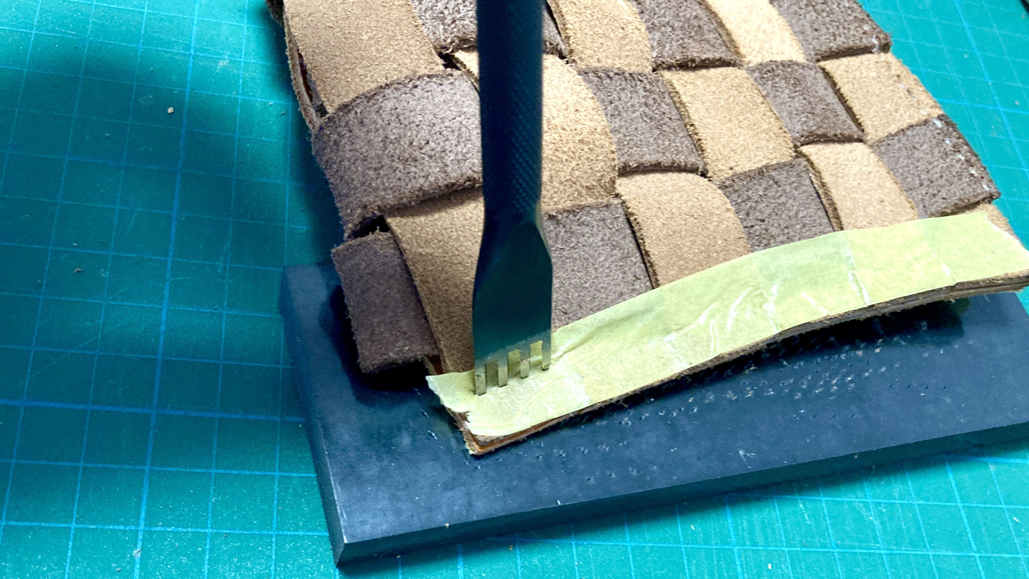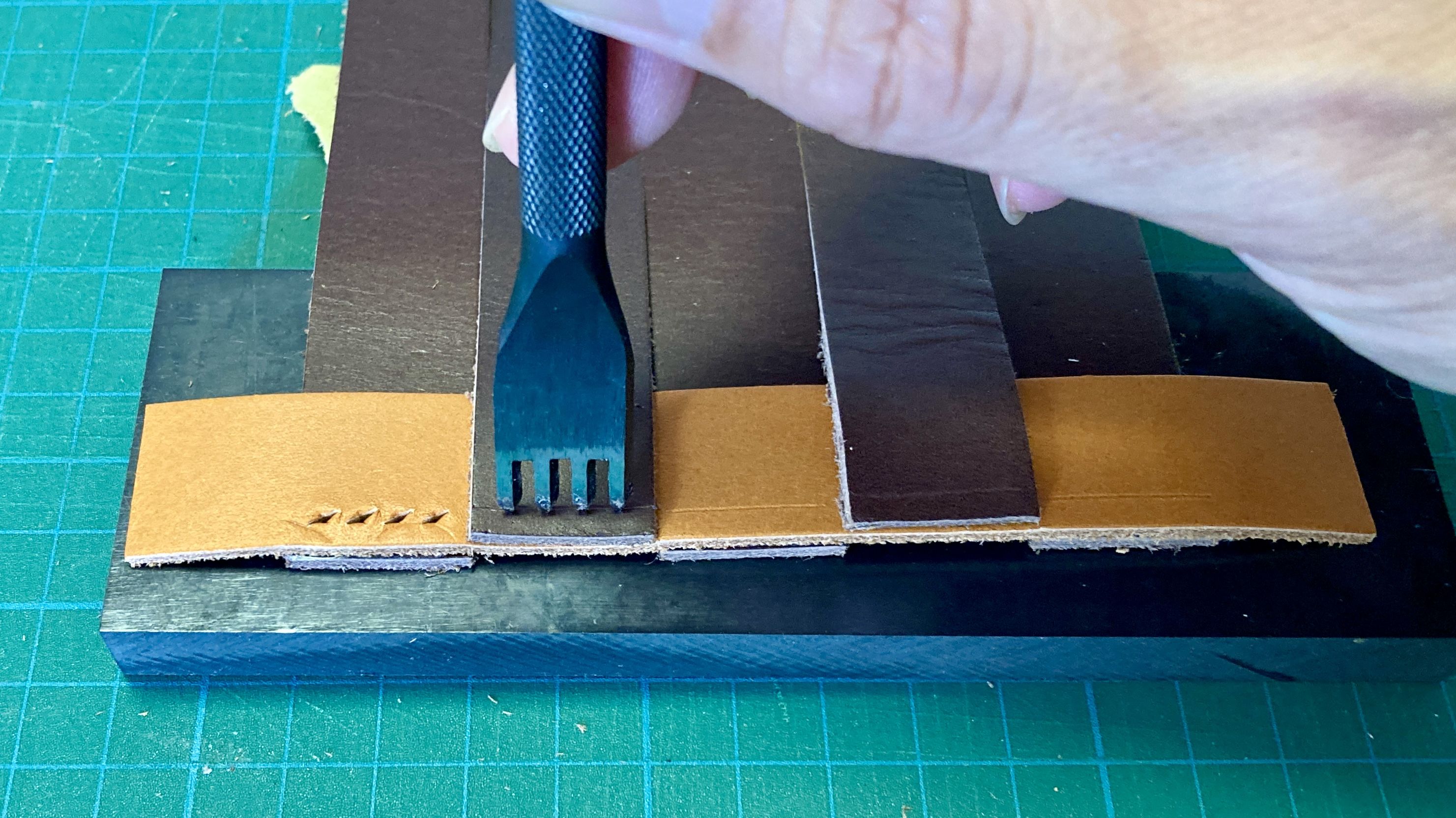 菱目打ちで穴をあけていきます。通常は端から順番に次へ次へと菱目打ちをずらしながら連続して穴をあけますが、今回は段差があるのでずれてくると思われます。
