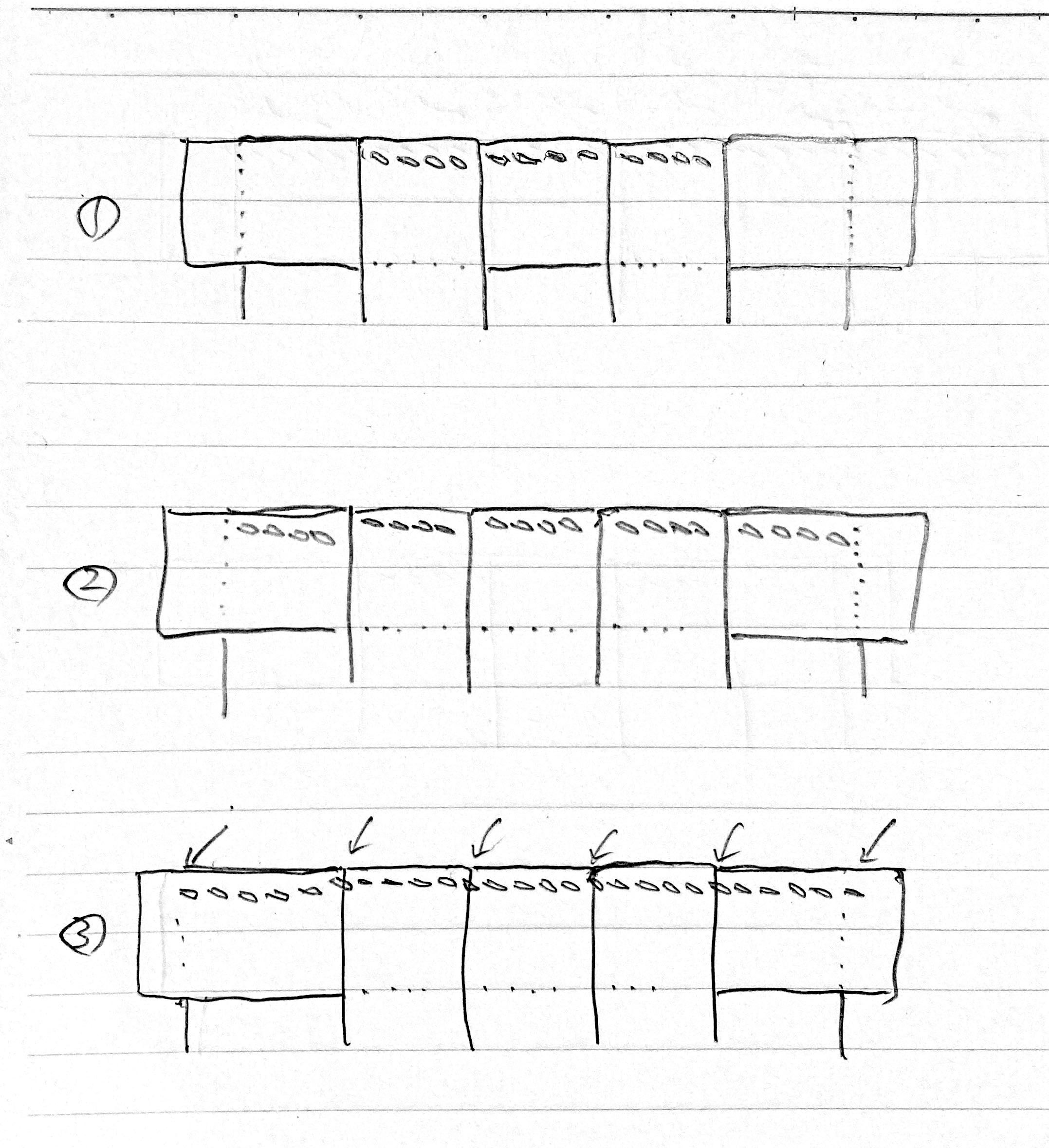 短い方をこんな風にはさんで両面テープでしっかり仮止めしたら、ていねいに縫うラインを入れます。