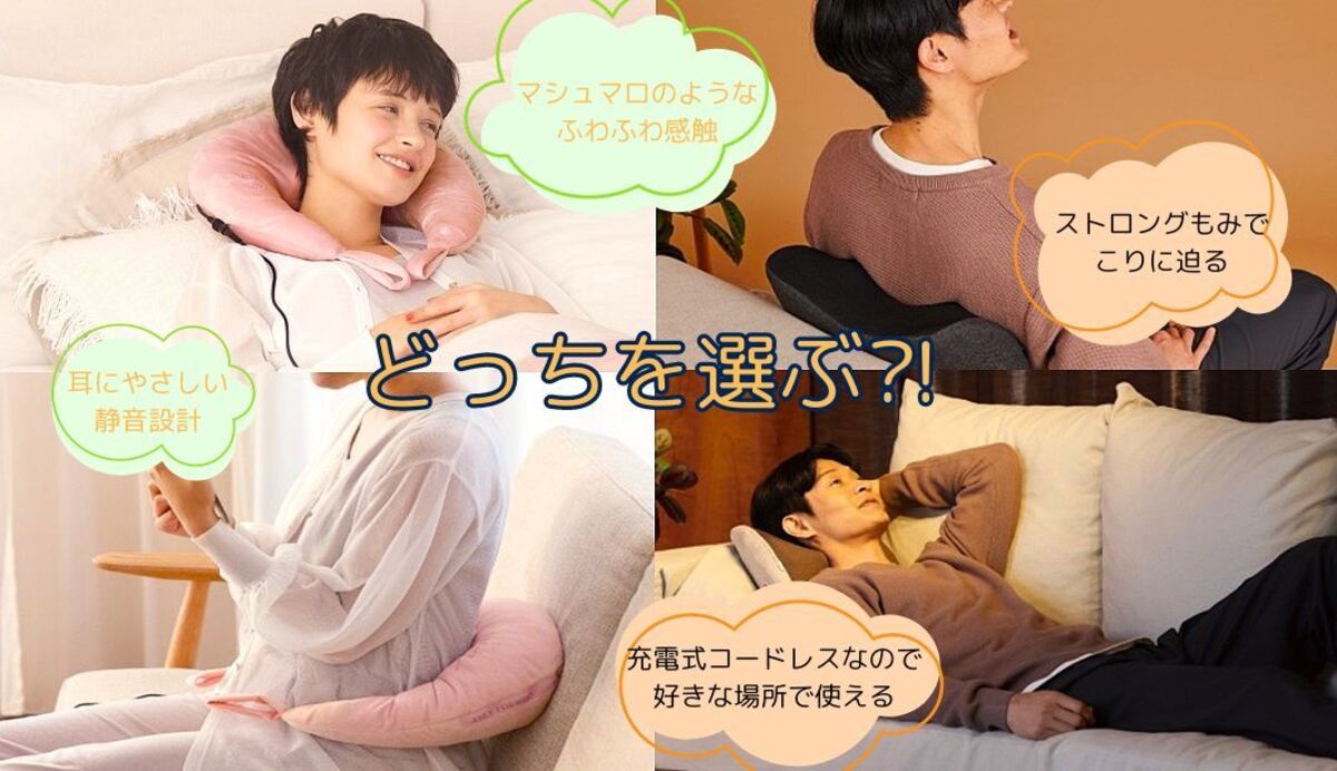 「ホットネックマッサージピロー」は癒されるようなデザインやカラー、使う際に負担の少ない軽さや静音設計など「ほっこりほぐしてくれる」タイプのマッサージ器なのに対して、「マッサージクッションコードレス」は突出量最大級の約65㎜のもみ玉からくるストロングもみの力強さとコードレスによる利便性を兼ね備えたマッサージ器でした。