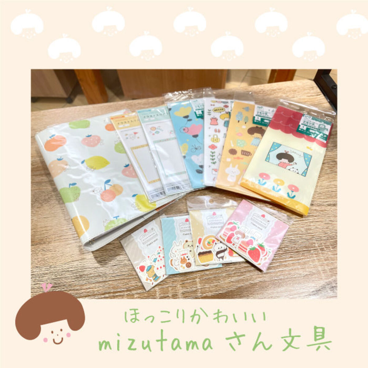 美味しそうなケーキや焼き菓子、mizutamaさんのかわいいキャラクターが楽しめるシールセットです。