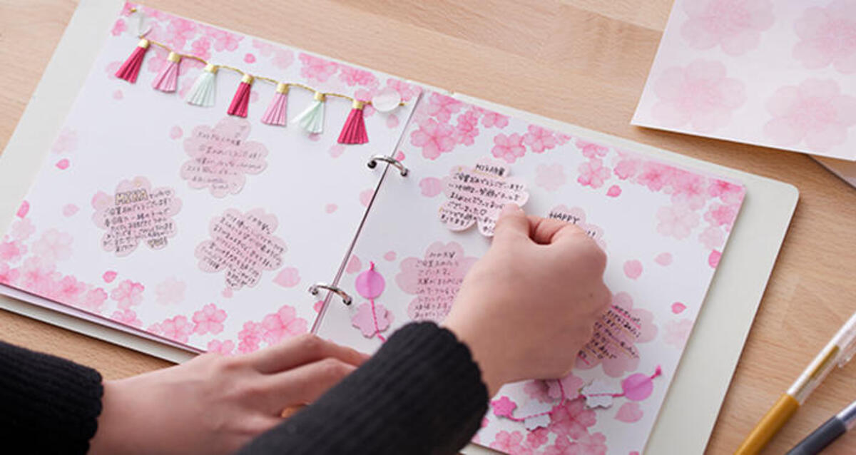 卒業でイメージする花といえば、やっぱり桜ですよね。アルバムの中にもたくさんの桜を咲かせたい方には、〈マークス〉のデコレーションアイテムがオススメ。桜の形をしたシールにメッセージを書いて貼ったり、かわいいガーランドで飾りつけたりと、つくり方も簡単。台紙にも桜柄を選べば、ギフトにもぴったりの華やかなアルバムの出来上がりです!