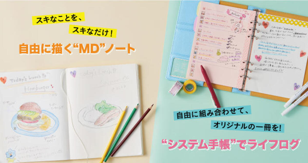 今回は、「自由」をテーマに2種類のノートをご紹介します。「アイデアを記録したい」「絵を描きたい」「日記をつけたい」「スケジュール管理をしたい」など、使用目的は人によってさまざま。自由度の高いノートを使ってあなただけのオリジナルノートをつくりましょう!