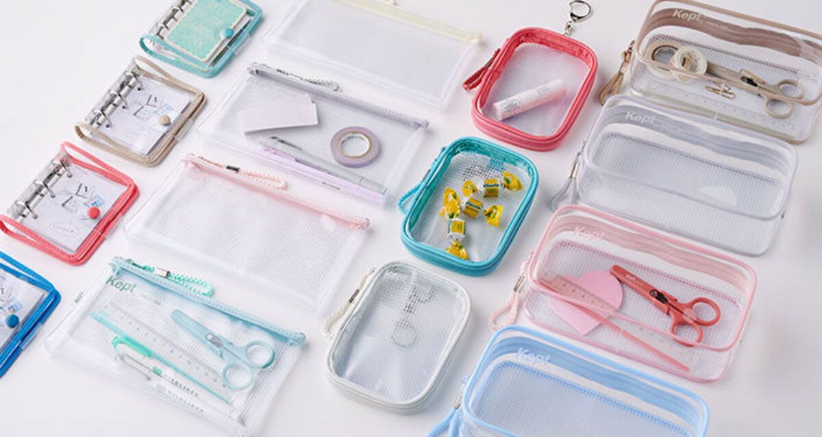 〈Kept〉のペンケース&ペンポーチは、開閉しやすい長めのストラップや厚手で丈夫な素材、シンプルで使い勝手のよいデザインで人気。前面は透明で背面はメッシュ入りなので、そのメッシュが背景になって中身がくっきりと見え、写真もキレイに撮れると評判です。ペンから小物までいろいろ収納していても、中身が見えるので使いたいものがすぐ見つかるのも、クリアボディのいいところですね。ともに新色7色が登場しました。