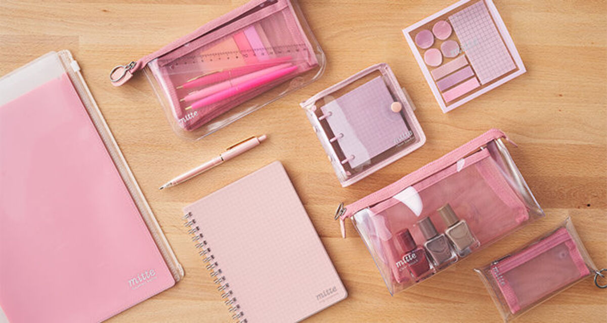 毎日持ち歩く文房具やコスメは、かわいいデザインを選びたいもの。せっかくならクリアポーチに入れて"中身魅せ"してみませんか?入れるだけで中身がおしゃれに見えてつい誰かにも見せたくなる、映えるクリアポーチ〈mitte(ミッテ)〉に、トレンドのくすみカラーとメッシュ素材を組み合わせた新作が登場。さらに今回はシャープペンシルやノート、バインダーなどの筆記用具も仲間入りしました!