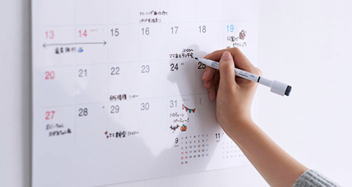 その便利さに魅了されて、リピーターも年々増加しているという人気アイテム。特長はなんといっても、全体がホワイトボードになっているので、何度でも文字を書いたり消したりできること。予定の記入はもちろんのこと、カラーマーカーを使って家族で色分けしたり、空いたスペースに絵を描いたり、色を塗ったり、子どももいっしょに家族みんなで楽しめます。また、カレンダーとしてだけでなく、ちょっとしたメモやメッセージボードとしても活躍してくれます。
